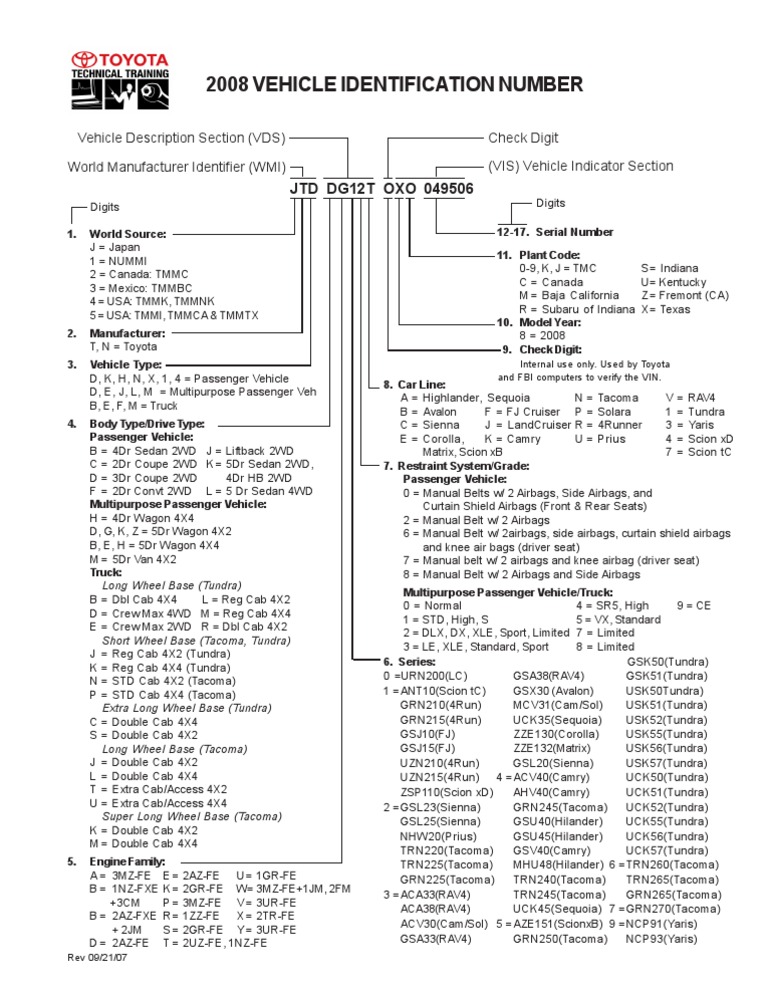 2008 Vin Decoder Toyota Front Wheel Drive Vehicles